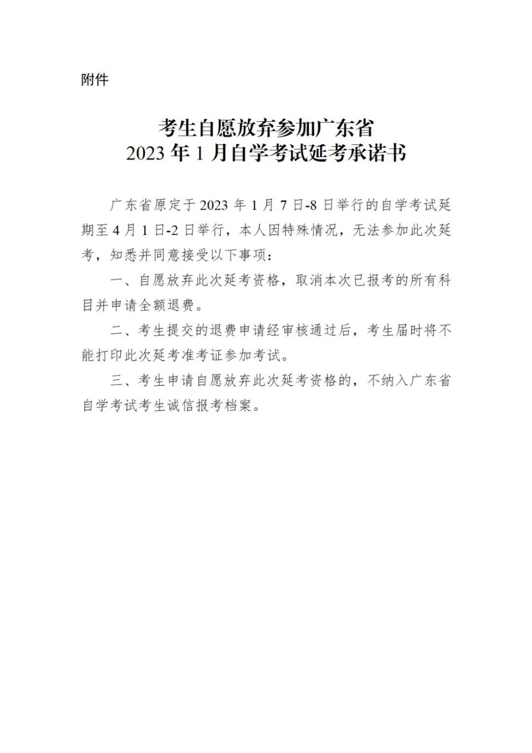 附件:《考生自愿放棄參加廣東省2023年1月自學(xué)考試延考承諾書》